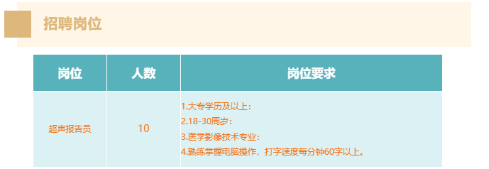 将应聘简历及证明材料一同投递邮箱tszxyyrs@163.com,邮件发送主题为:超声报告员-专业-学历-姓名-年龄。(邮件主题未按规定填写,报名不成功)