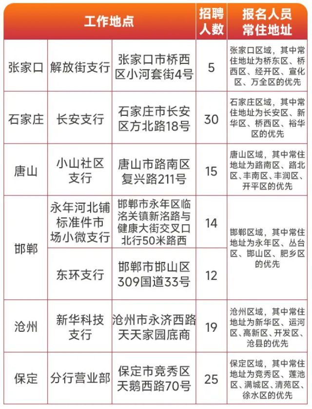 本次在张家口、石家庄、唐山、邯郸、沧州、保定六个地区,合计招聘120人,具体工作地点及招聘人数如下: