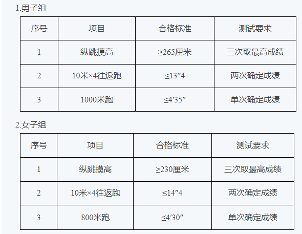 体能测评项目及合格标准如下:
