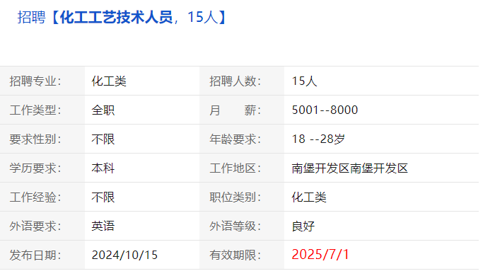 工作职责:负责化工生产工艺技术管理、新工艺引进及应用、日常生产运维工作。